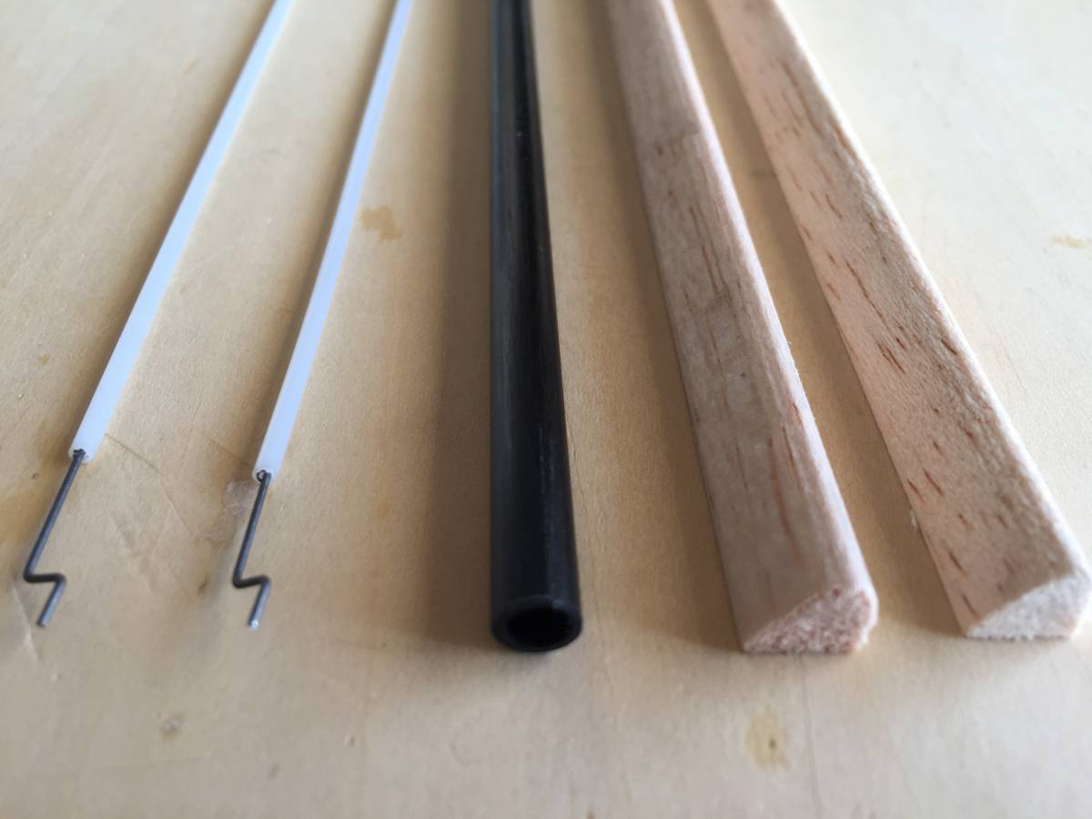 カーボンテールブーム、リンケージパーツ、翼用紙、原寸設計図、整形済み前縁が付属しています。